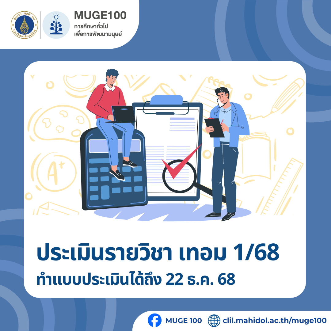 ขอเชิญชวนนักศึกษารายวิชา MUGE 100 การศึกษาทั่วไปเพื่อการพัฒนามนุษย์ ตอบแบบประเมินรายวิชา สำหรับภาคการศึกษาต้น ปีการศึกษา 2568 เพื่อที่รายวิชาจะนำผลประเมิน และข้อเสนอแนะของนักศึกษาไปพัฒนารายวิชาต่อไป