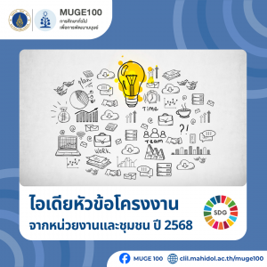 รายวิชา MUGE 100 การศึกษาทั่วไปเพื่อการพัฒนามนุษย์ ร่วมกับศูนย์ส่งเสริมการเรียนรู้แบบบูรณาการชีวิต มหาวิทยาลัยมหิดลได้เชิญชวนส่วนงานและหน่วยงานภายในมหาวิทยาลัยมหิดล ตลอดจนหน่วยงานภาครัฐ ภาคเอกชน และชุมชนโดยรอบมหาวิทยาลัยร่วมแชร์ไอเดียโจทย์หรือปัญหาที่สอดคล้องกับ เป้าหมายการพัฒนาที่ยั่งยืน...