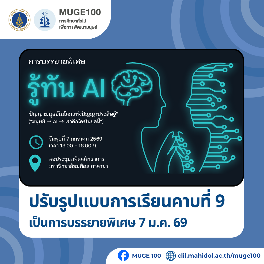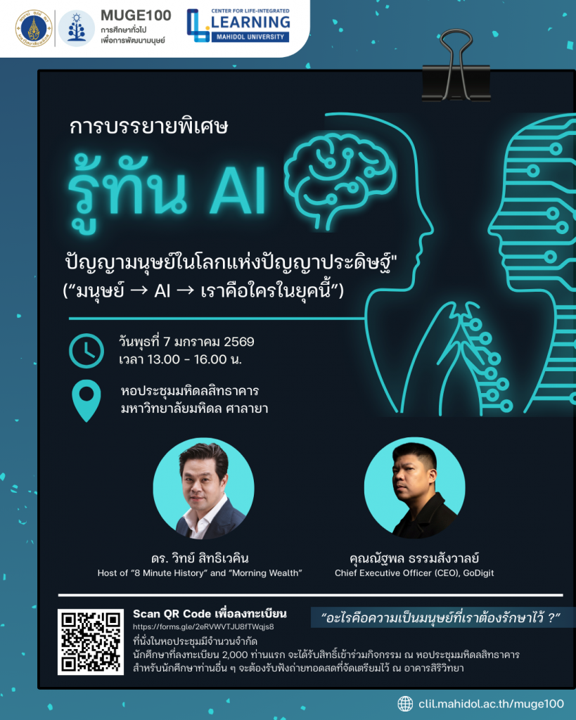 รายวิชา MUGE100 การศึกษาทั่วไปเพื่อการพัฒนามนุษย์ ร่วมกับศูนย์ส่งเสริมการเรียนรู้แบบบูรณาการชีวิต จัดโครงการการบรรยายพิเศษในหัวข้อ “รู้ทัน AI: ปัญญามนุษย์ ในโลกแห่งปัญญาประดิษฐ์ (“มนุษย์ → AI → เราคือใครในยุคนี้”)” ในวันพุธที่ 7 มกราคม 2569 เวลา 13.00 – 16.00 น. ณ หอประชุมมหิดลสิทธาคาร มหาวิทยาลัยมหิดล ศาลายา โดยมีวัตถุประสงค์เพื่อเสริมสร้างความตระหนักรู้เกี่ยวกับ AI แก่นักศึกษารายวิชาให้เท่าทันการเปลี่ยนแปลงในยุคเทคโนโลยีสมัยใหม่