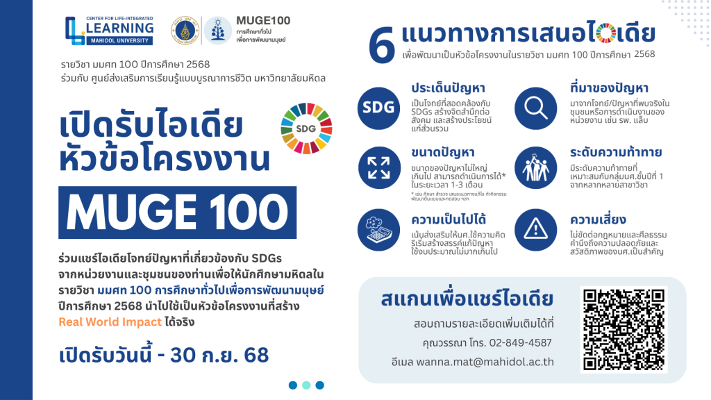 มหิดลเปิดรับไอเดียโจทย์ปัญหา/ความต้องการที่สอดคล้องกับ SDGs จากหน่วยงานภายในและภายนอกมหาวิทยาลัย และจากชุมชน เพื่อให้นักศึกษาพัฒนาเป็นหัวข้อโครงงาน MUGE100 ปีการศึกษา 2568