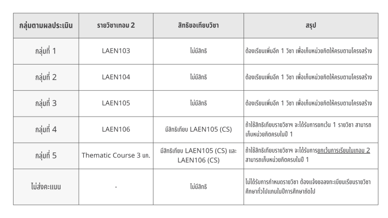 1. นักศึกษาสามารถส่งผลการประเมินความรู้ความสามารถทางภาษาอังกฤษ ผ่านระบบลงทะเบียน เพื่อรับการจัดในกลุ่มตามระดับความรู้ความสามารถทางภาษาอังกฤษเป็น 5 กลุ่ม กำหนด “รายวิชาภาษาอังกฤษ” ที่นักศึกษาจะต้องลงทะเบียนเรียนในแต่ละภาคการศึกษา ในชั้นปีที่ 1 และกำหนด “สิทธิการขอเทียบรายวิชาและโอนย้ายหน่วยกิตรายวิชาภาษาอังกฤษ” ภายใน 17 พฤศจิกายน 2568 โดยประเภท “คะแนนผลการทดสอบภาษาอังกฤษ” ที่สามารถใช้เป็นผลประเมิน และเกณฑ์การจัดกลุ่มตามผลประเมิน แสดงดังภาพด้านล่าง