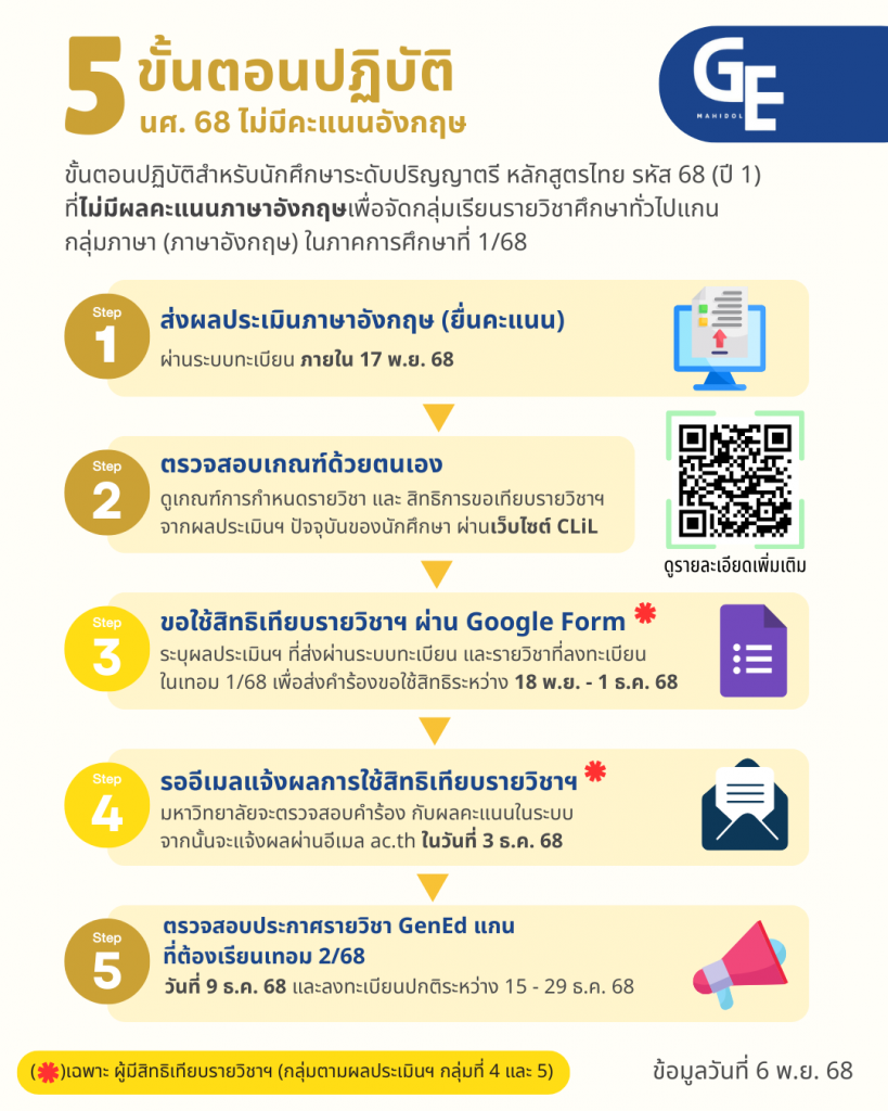 4. (เฉพาะนักศึกษามีผลประเมินฯ ในกลุ่ม 4 และ 5) นักศึกษาตรวจสอบผลการใช้สิทธิเทียบรายวิชาและโอนย้ายหน่วยกิตรายวิชาภาษาอังกฤษผ่านทางอีเมลมหาวิทยาลัย (@student.mahidol.ac.th และ @student.mahidol.edu) ภายในวันที่ 3 พฤศจิกายน 2568