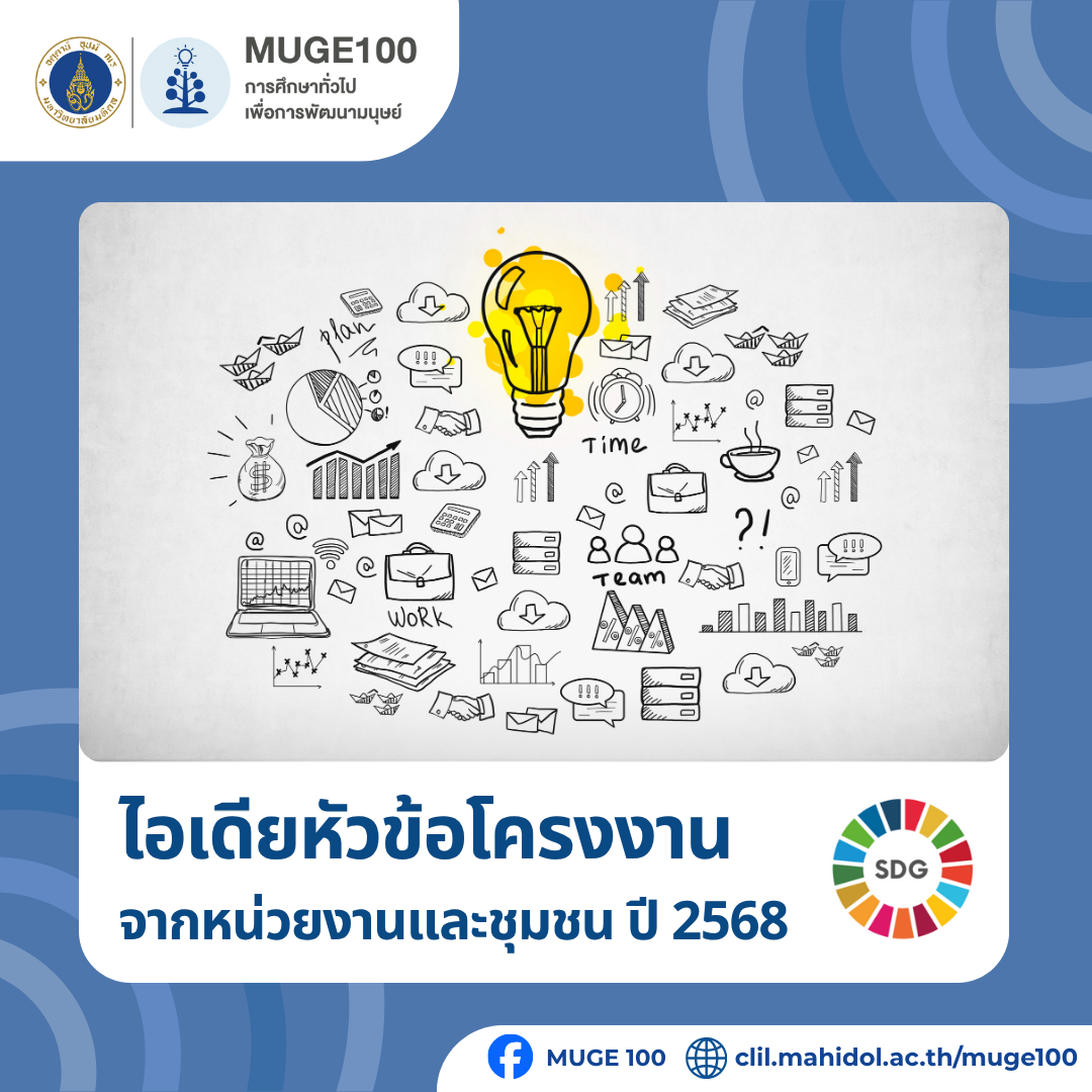 รายวิชา MUGE 100 การศึกษาทั่วไปเพื่อการพัฒนามนุษย์ ร่วมกับศูนย์ส่งเสริมการเรียนรู้แบบบูรณาการชีวิต มหาวิทยาลัยมหิดลได้เชิญชวนส่วนงานและหน่วยงานภายในมหาวิทยาลัยมหิดล ตลอดจนหน่วยงานภาครัฐ ภาคเอกชน และชุมชนโดยรอบมหาวิทยาลัยร่วมแชร์ไอเดียโจทย์หรือปัญหาที่สอดคล้องกับ เป้าหมายการพัฒนาที่ยั่งยืน (Sustainable Development Goals: SDGs) สำหรับเป็นไอเดียตั้งต้นในการคิดหัวข้อโครงงานโดยมีหัวข้อดังนี้