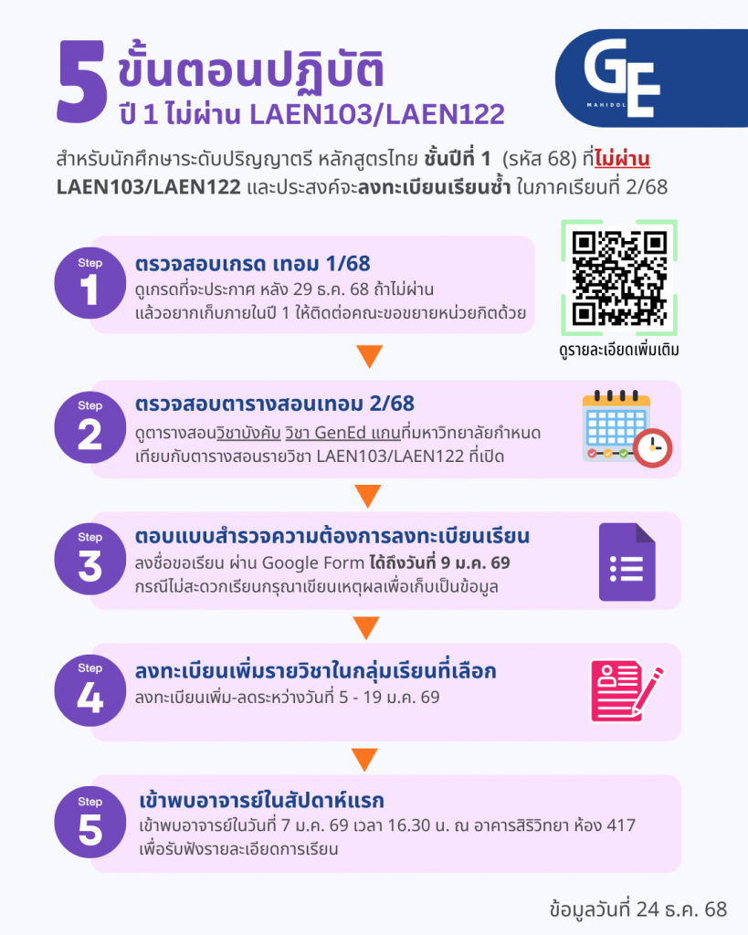 1. นักศึกษาตรวจสอบผลการศึกษา (เกรด) รายวิชา LAEN103 หรือ LAEN122 ที่ลงทะเบียนเรียนในภาคการศึกษาที่ 1/68 หลังจากวันที่ 29 ธันวาคม 2568